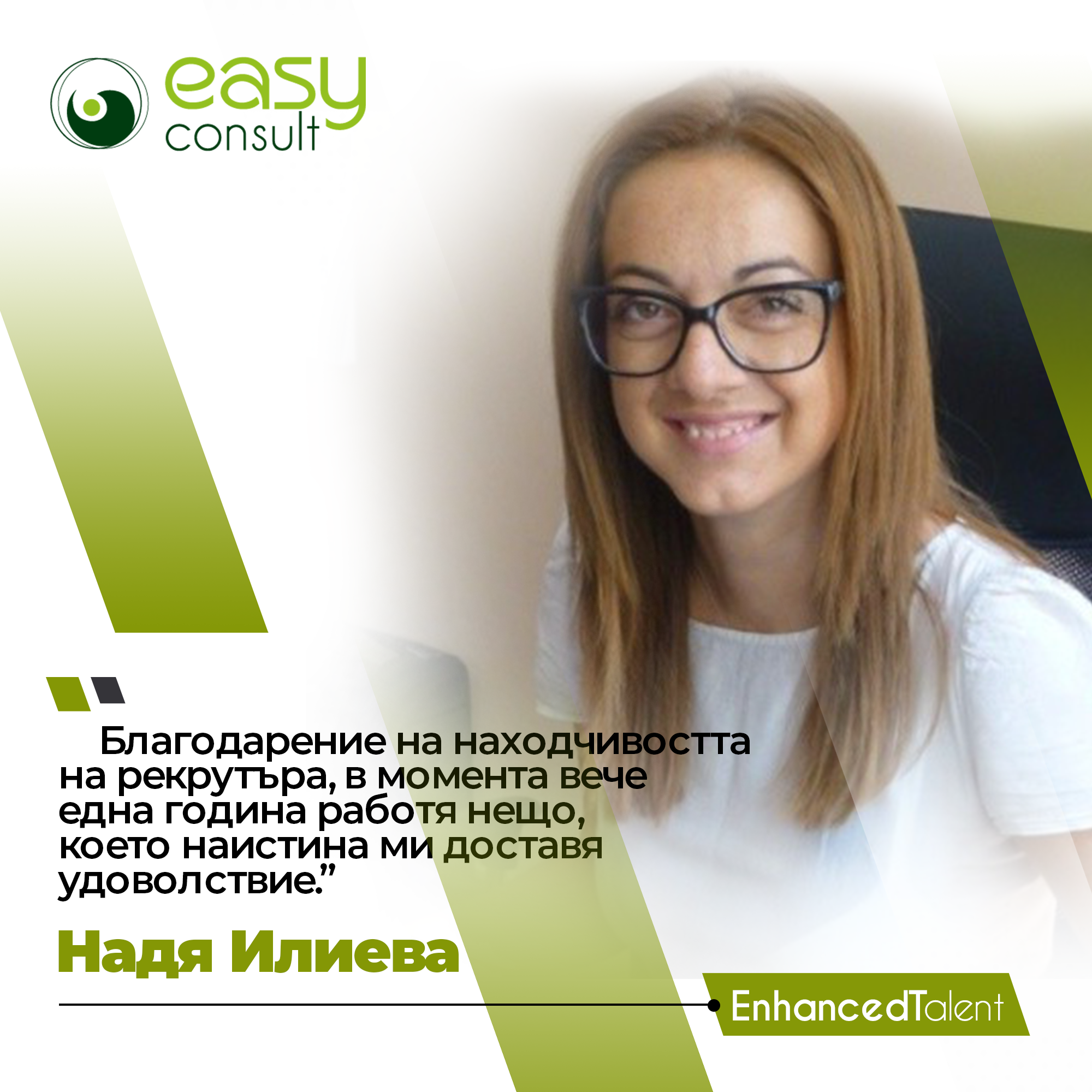 Рекрутър от екипа на Изи се свързва с Надя, търсейки препоръка за човек, занимаващ се с международни проекти заради предишния й опит, но открива прекрасен кандидат и в нейно лице и успява да я убеди да пробва и самата тя. “Благодарение на находчивостта на рекрутъра в момента вече една година работя нещо, което наистина ми доставя удоволствие.”, споделя Надя.