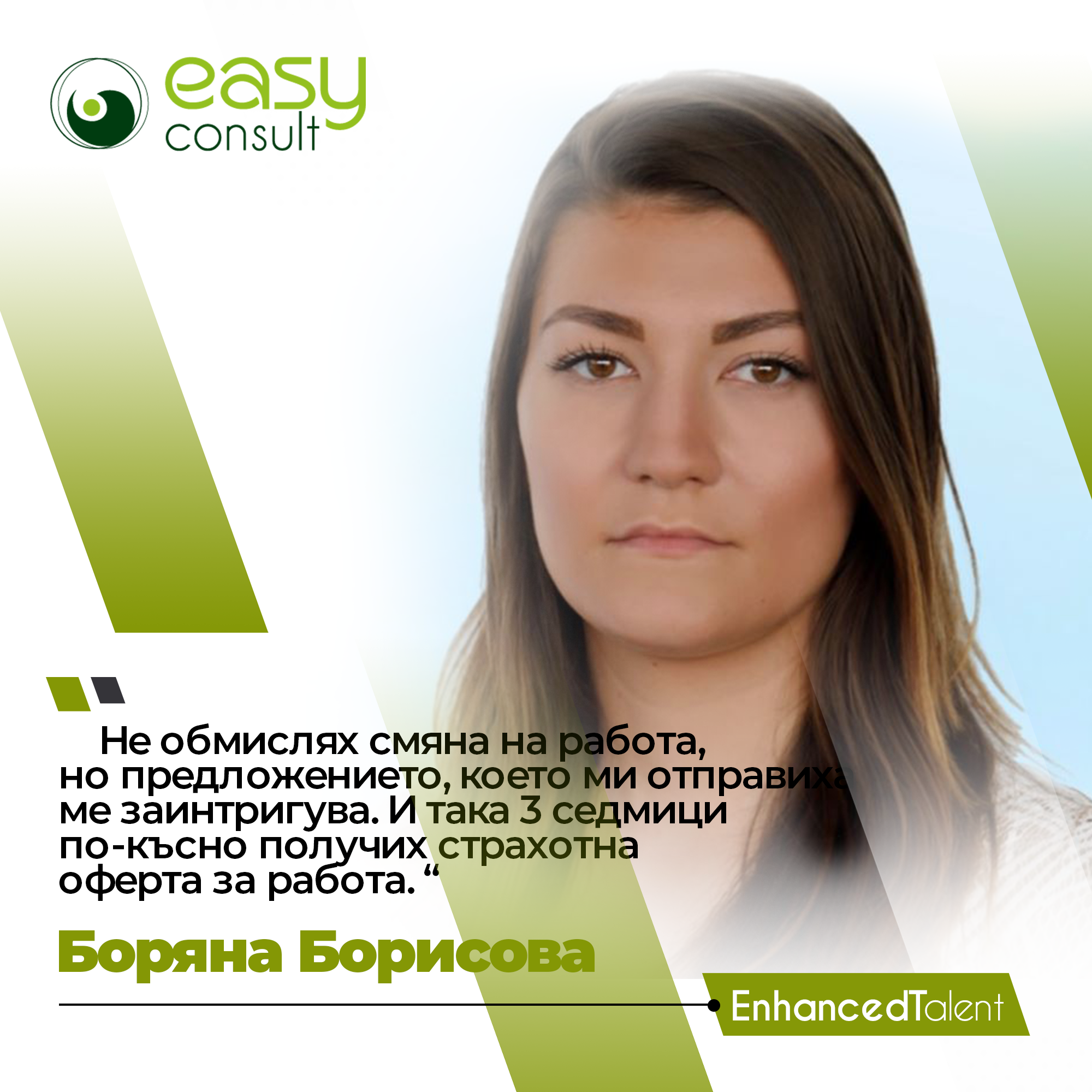 Тя е сред онези професионалисти, които рекрутърите на Изи Консулт са успели да намерят и „изловят“, убеждавайки ги, че, когато става дума за талантливи специалисти като нея, новата работа не е въпрос на нужда, а много повече на професионално и личностно развитие.  В процеса на работа със специалистите по подбор на персонал от Изи Консулт, Боряна се е убедила в едно – това е изключително полезен ход за всеки, независимо дали сам търси работа или са се свързали с него. Кандидатът е достатъчно стресиран с подготовка на автобиография, преглеждане на обяви, организиране на интервюта, но когато има на своя страна консултант, той успява да селектира подходящите работодатели и оферти според силните страни на кандидата.