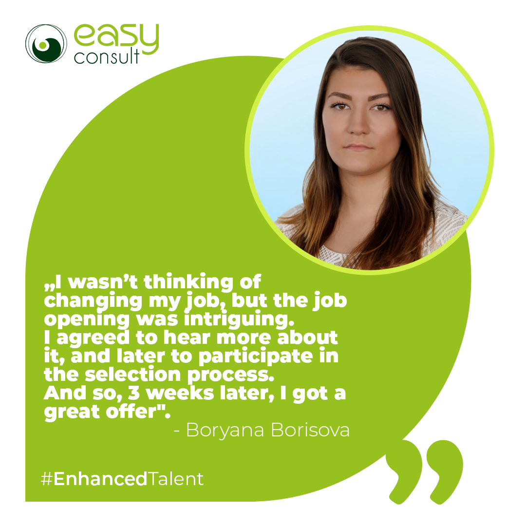 Boryana is of those professionals that the recruiters of Easy Consult managed to find and “catch” by convincing them that for talented specialists a new job is not a necessity but much more professional and personal development. While working with the recruitment specialists of Easy, Boryana was able to see by herself how useful this can be for every candidate, be they active or passive – a candidate is always stressed out by preparing documents, seeking through offers, and organizing interviews. When you are supported by a recruitment specialist, he is the one helping you to select the employer and the offer that will best match your profile and strongest sides.